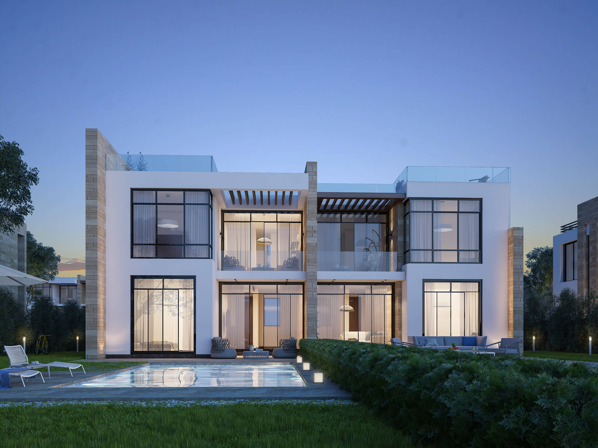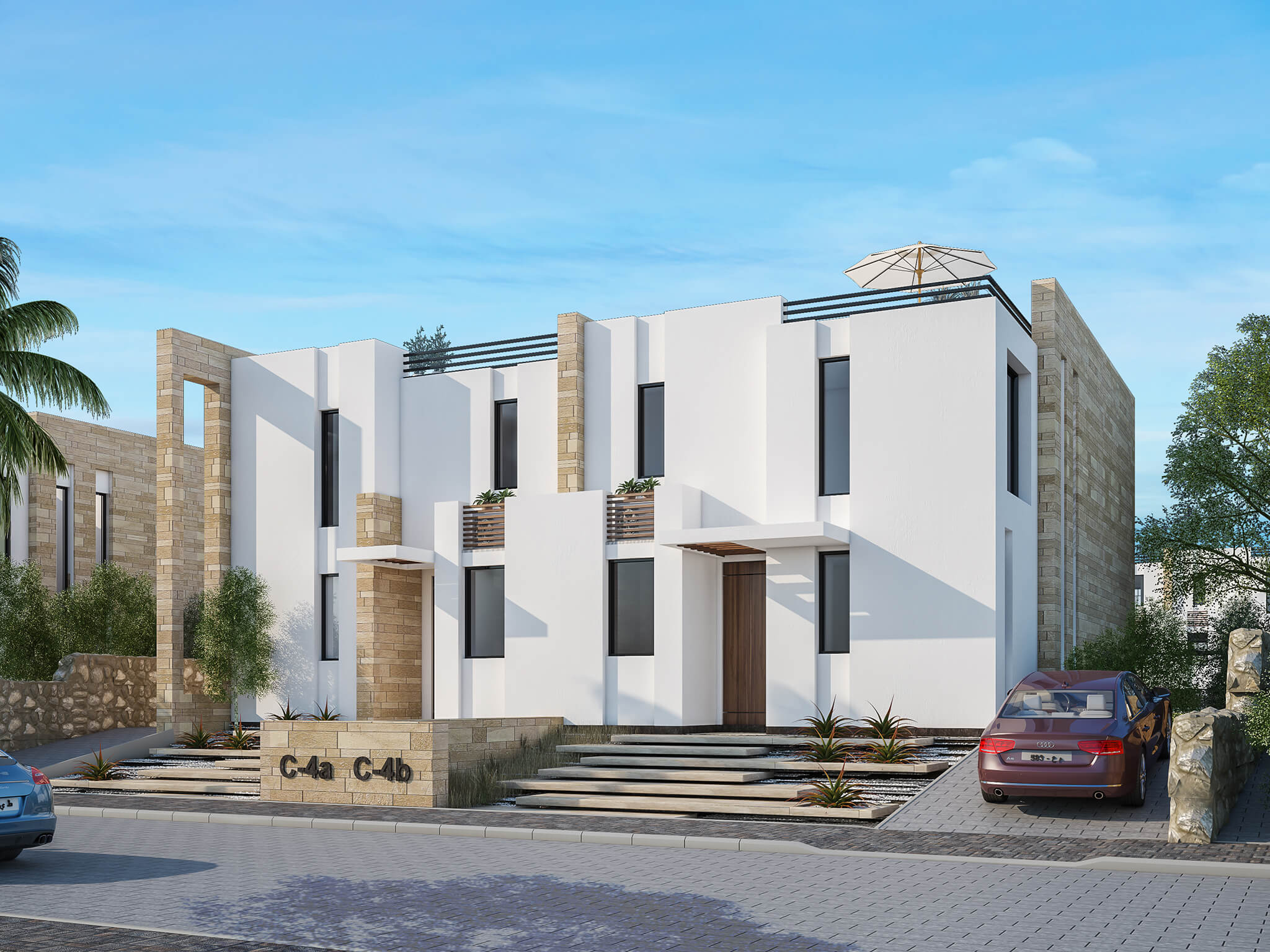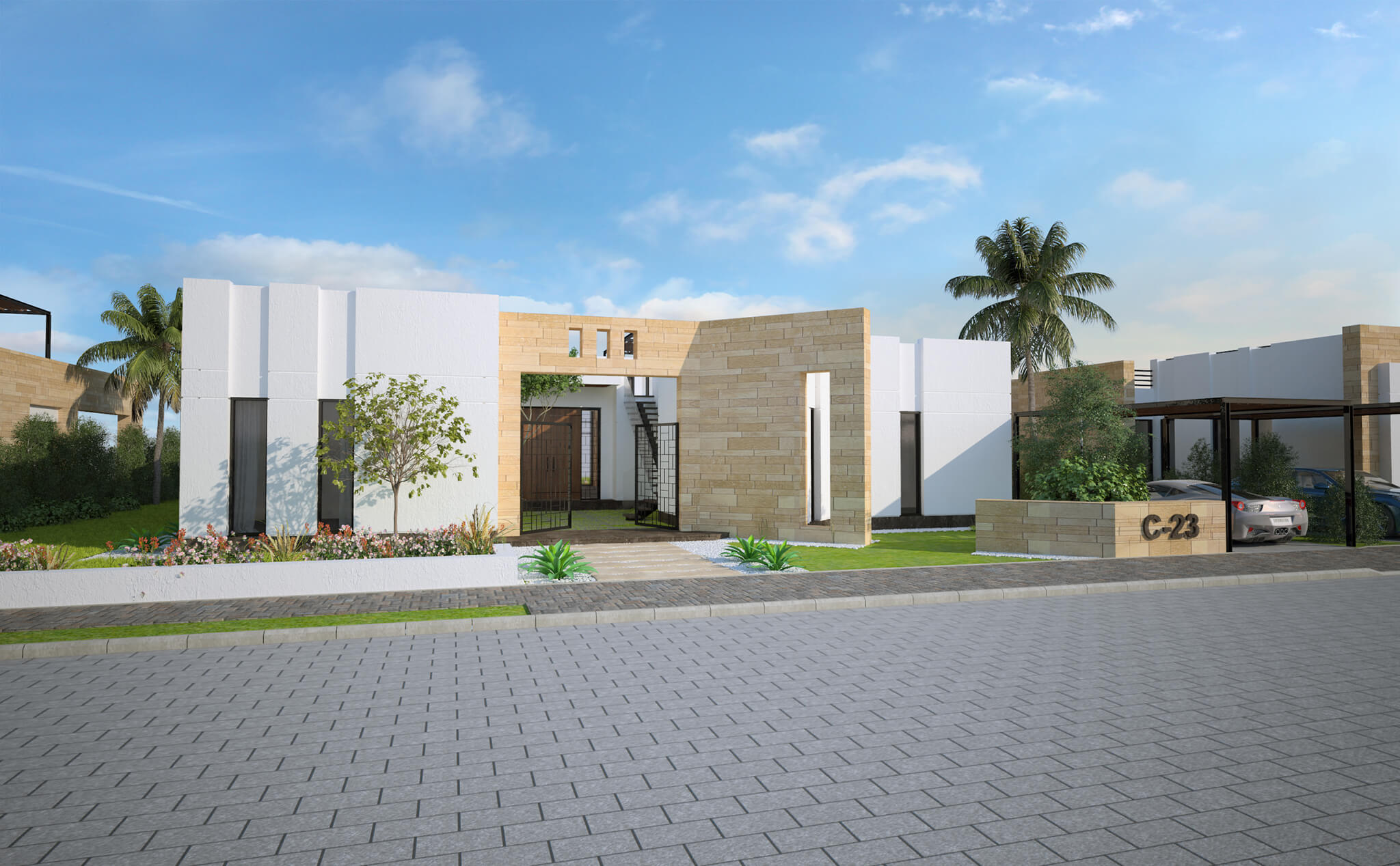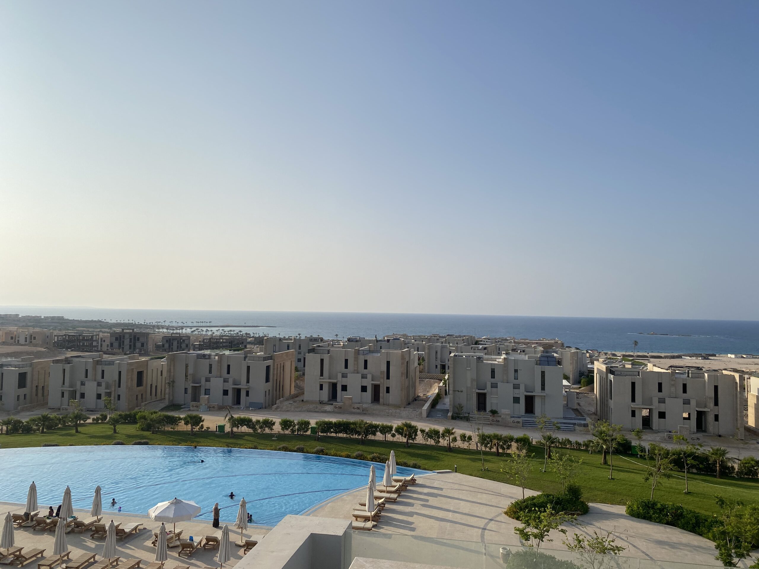 Caesar Bay Residences master-plan design takes into consideration the site topography and the natural surrounding context. The residences are built in tiers to provide a beautiful panoramic sea view. Designing a lifestyle rather than concrete buildings; the architectural design concept is to blend architecture, landscape and beach, in addition to indoor and outdoor spaces. This is achieved by providing architectural and interior features that emphasize maximum natural light penetration and ventilation to the internal spaces through green courtyards, high ceiling, skylights, full façade glazing with sea view, large terraces and shaded roof decks.